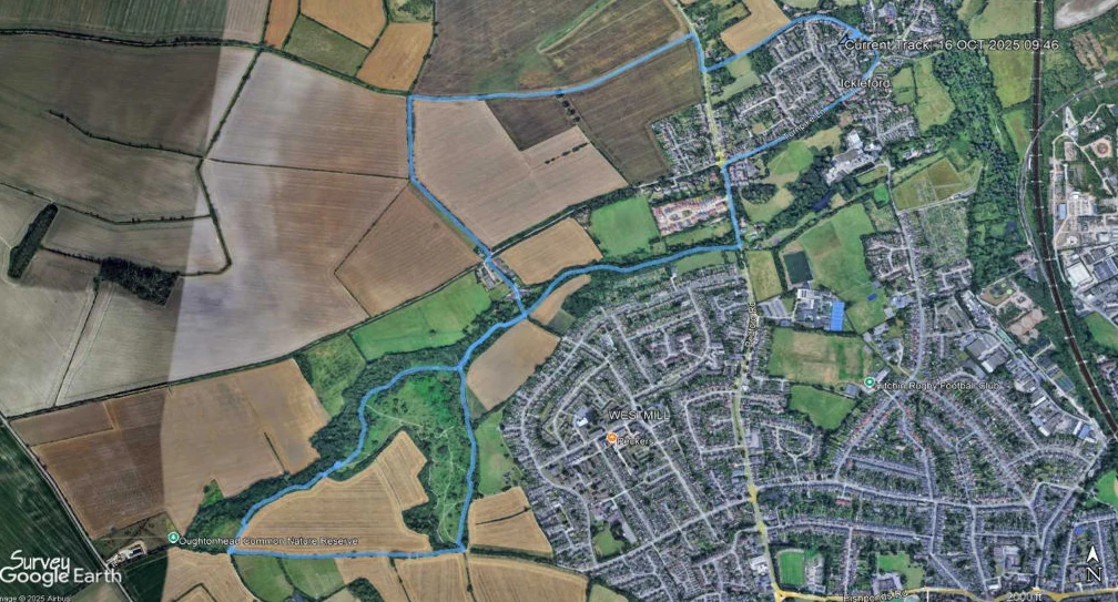 This walk was similar to the route that walked in 2023. From the pub, we turned left along Chambers Lane before taking to a footpath by Ickleford Sports and Recreation Club. We crossed the A600 and turned north for a short distance. The we turned onto Icknield Way to the west. Continuing to the west, this footpath turned into Hambridge Way. At about 1.1 miles into the walk, we turned left towards Westmill Lane.